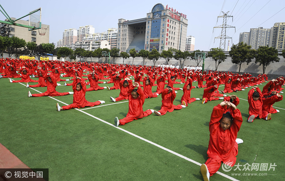 2017年6月28日,山東濟(jì)南育賢第二小學(xué)的400余名學(xué)生習(xí)太極拳健身。 張勇(山東分社)/中新社/視覺中國(guó)