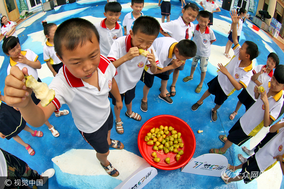 2017年7月9日,一場別開生面的學童減壓活動在山東煙臺37°夢幻海水樂園舉行,小學生們將寫有“作業太多”、“考試太難”等字樣的鴨梨拋上天空,并舉行吃鴨梨比賽,通過消滅鴨梨(壓力)的方式,趕走壓力,放松身心,快樂度暑假。