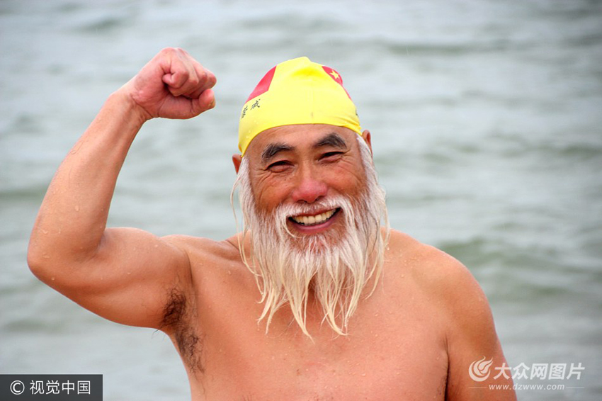 7月16日,在榮成市濱海公園海水浴場,1名71歲老者游完全程后在水中擺出加油的Pose拍照留念。