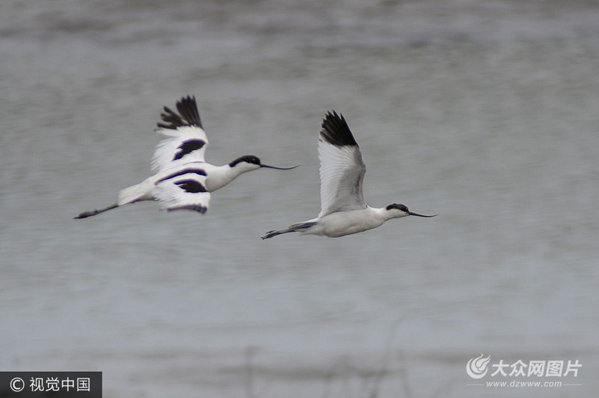 7月15日,青島市白沙河入海口濕地,兩只反嘴鷸飛過沼澤巡游覓食。
