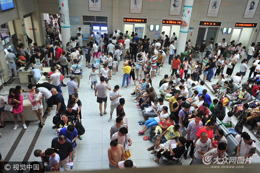 7月26日,在濟南市兒童醫院,許多家長帶著患兒排隊等候就診。