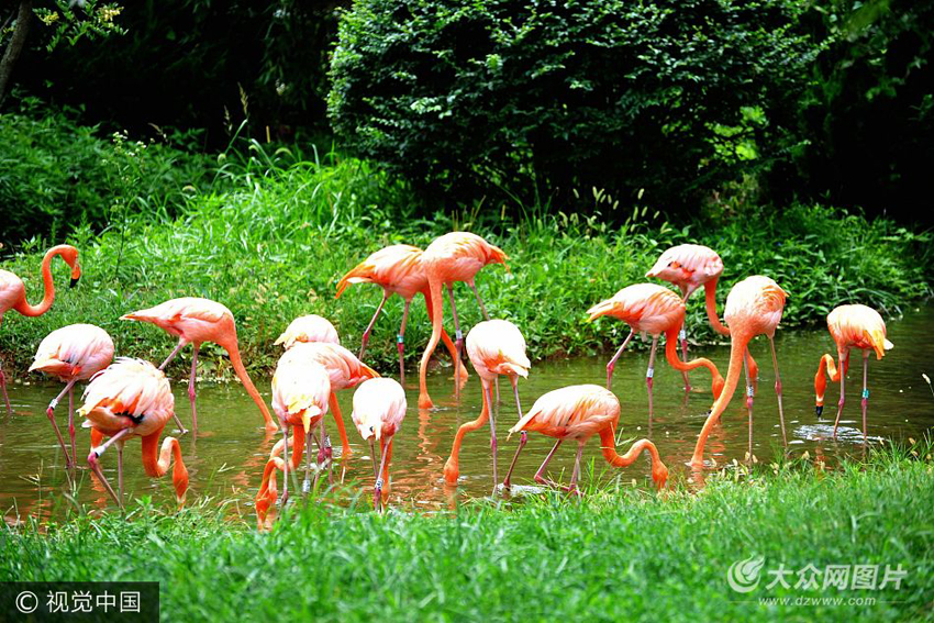7月29日,正值盛夏高溫,在青島森林野生動物世界,來自地中海沿岸的火烈鳥們在綠茵從中的水池里優雅的度步、覓食,享受池水帶來的清涼。