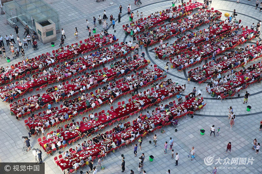 8月12日晚,東營,市民在“百家宴”上吃飯聊天看節目,樂享鄰里和睦親情。當天,東營市東營區勝利街道睦鄰文化藝術節在中山社區華都世紀城小區廣場開幕,700多名市民每人端來一盤精心準備的拿手好菜,在廣場上擺出90桌宴席。他們圍坐在一起,品嘗各色美食,暢飲喜慶美酒,話家長里短,看精彩演出,現場其樂融融,溫馨和睦。90張方桌整齊地擺放在廣場上,現場你來我往,場面極其壯觀。