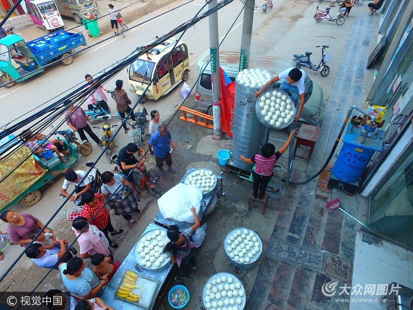 2017年8月13日,山東聊城,90后青年汪偉將蒸熟的高樁饅頭、花卷下鍋打膳。
