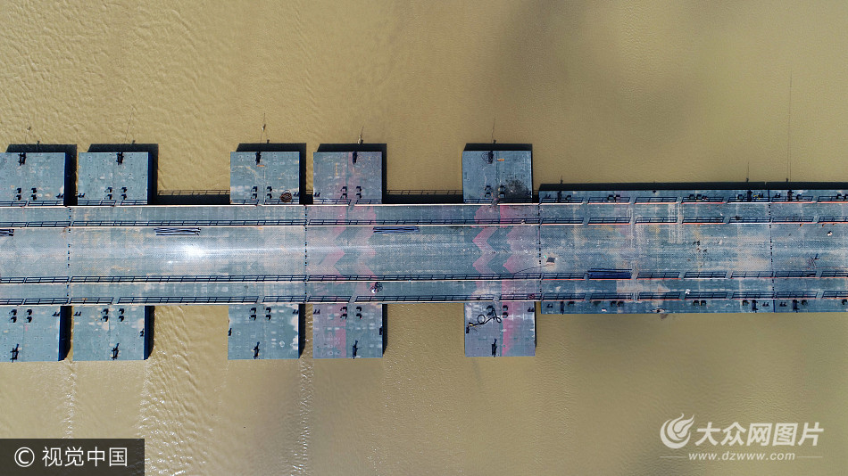2017年8月15日,濟(jì)南,在黃河濟(jì)南濼口段,經(jīng)過14天的施工,新濼口浮橋基本能安裝完成,6艘34米長的承壓舟組成了新橋。