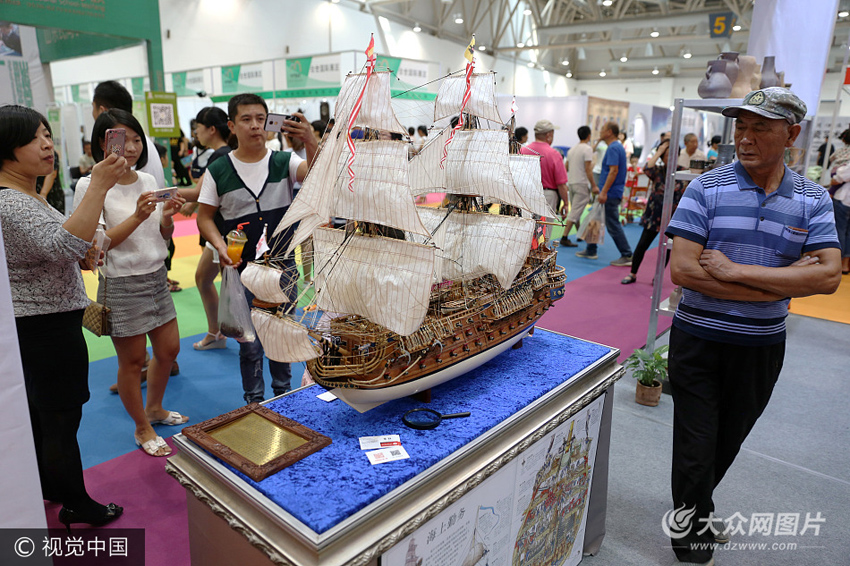 海峽兩岸博覽會上,觀眾在參觀一家文創(chuàng)企業(yè)帶來的西班牙圣菲利普號帆船模型。