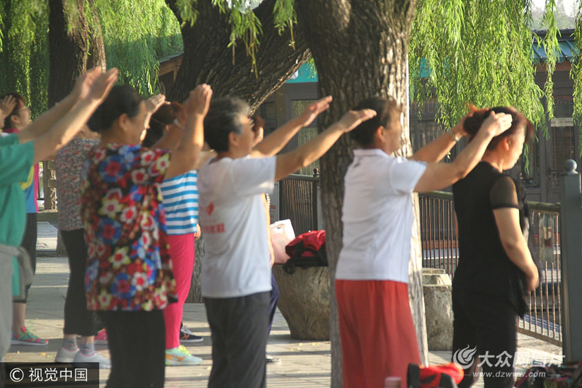 9月20日清晨,在濟南大明湖景區內,數百大爺大媽互相拍打肩膀跳操,幽默滑稽的體育動作,逗笑不少過往游客。