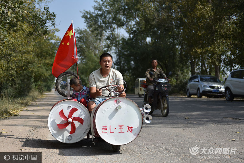9月初,他們兩個人先是造了一輛單排的車。車身是用兩個廢舊的潤滑油桶焊接起來做成的。車架子就是用廢舊的三角鐵、鋼管等焊接,車輪是電動車的輪子,采用電動車的動力系統助力。