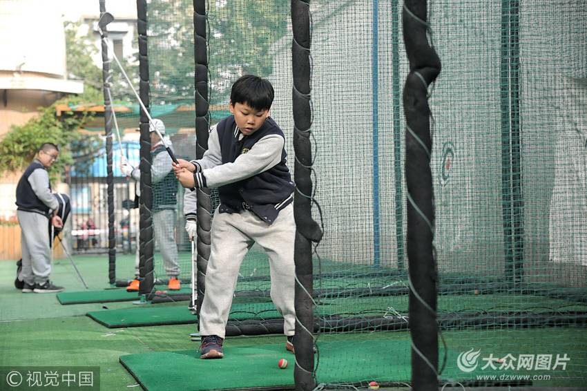10月13日,在濟南市經五路小學,同學們在教練的指導下上高爾夫球課。據悉,去年11月,該校將這項“紳士運動”引入校園,不但作為社團選修課,還將其寫入三年級課表,成為必修內容。為了能讓孩子有更多的練習機會,學校還建起了600平方米的迷你練球場,揮桿、擊球、推球……經過近一年的學習,不少孩子已打得有模有樣;@球課、羽毛球課、乒乓球課……這些體育類項目在小學開設已很普遍,但小學開設高爾夫球課在濟南還屬首次。