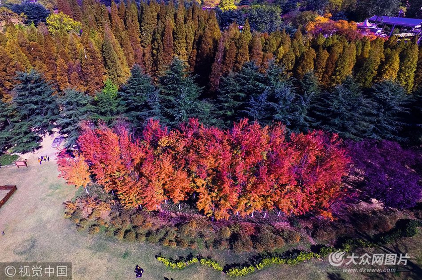 2017年10月29日,在青島市中山公園一帶,美國紅楓霜后愈烈,各種秋葉絢爛如調色板,開啟“最美”秋天模式。