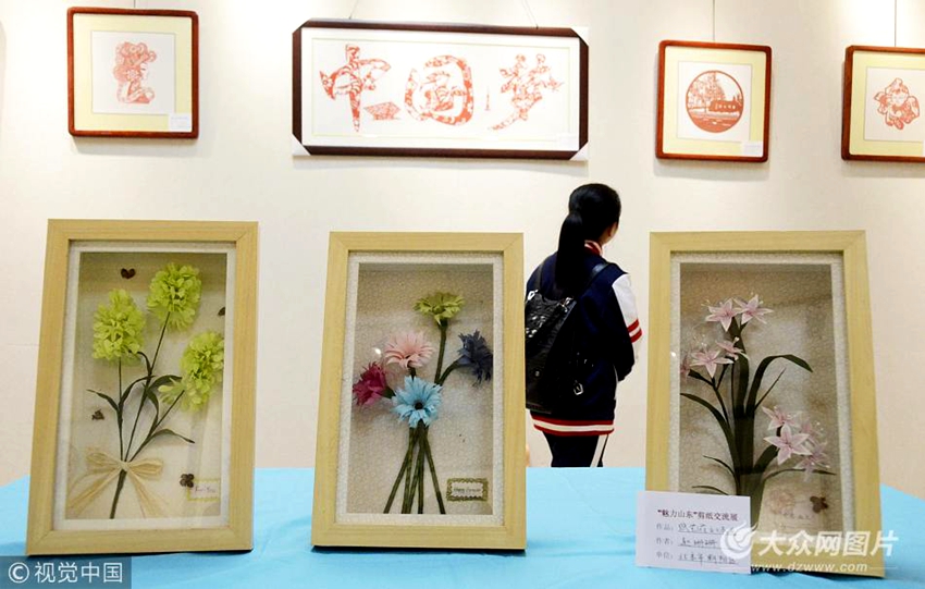 2017年11月2日,在山東省濱州市濱州學院剪紙展廳,展出的立體剪紙作品。