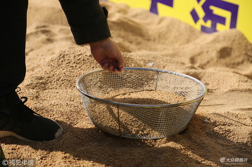 2017年11月11日,濟南高新區街頭,不少市民在用鏟子在沙子里“淘金”。