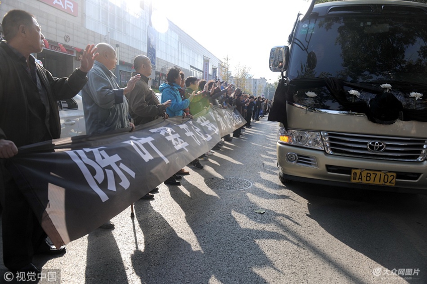 2017年11月12日,在濟南市甸新東路,千名甸柳一區(qū)的居民自發(fā)站在道路兩旁,手拉橫幅送別他們的好書記陳葉翠。
