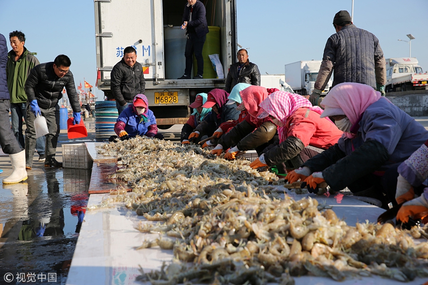 2017年11月15日下午,在山東東營市的黃河口中心漁港,出海回來的漁船剛一靠岸,水產批發商們就蜂擁而上。專業分揀海鮮的9位“漁嫂”每人手持小竹片一字排開,穩坐在岸邊的“爬蝦山”前,非常嫻熟地開始了緊張的分揀工作。