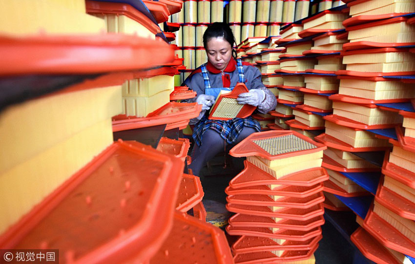 農民在淄博市沂源縣歷山街道一濾清器企業車間對產品進行手工整理。