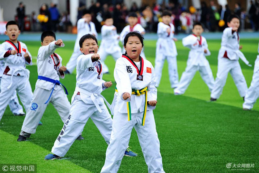 小學生們在表演“跆拳道”。