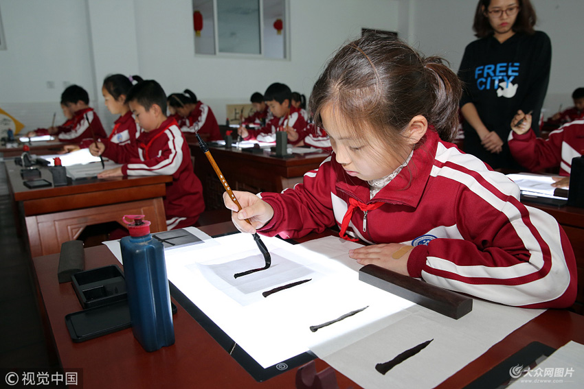 12月7日,東營東營市東營區英才小學的孩子們正在數字書法教室上書法課。近日,東營市首個數字書法教室在該校正式建成并投入使用。數字書法教室有48套交互式數字臨摹臺,引進國內最先進的智云數字書法教學系統軟硬件設備,教師只需要在電子白板上進行演示、講解,書法大家的書寫示范與教程動畫演示、書法老師的筆法等都可以通過學生端的交互式數字臨摹臺表現出來,實現了書法大師走進課程“一對一”教學的效果;同時,學生還可以登錄自己的交互式數字臨摹臺進行自學和練習。這種“一對一”、“手把手式”的教學激發了同學們的興趣,學生可以在交互式數字臨摹臺上臨摹感觸書法精髓,再通過傳統書法工具——筆墨紙硯進行臨摹和練習,既保留了傳統的筆墨紙硯的書法教學模式,又創新的引入數字化信息手段。