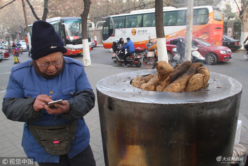 2017年12月28日,在山東濟南大觀園附近,一位大爺守攤人自己發明烤梨成網紅,稱自己下崗后賣烤紅薯養家糊口,烤梨是第一個發明者。如今孩子又要娶媳婦,不得不在外干活烤紅薯烤梨。
