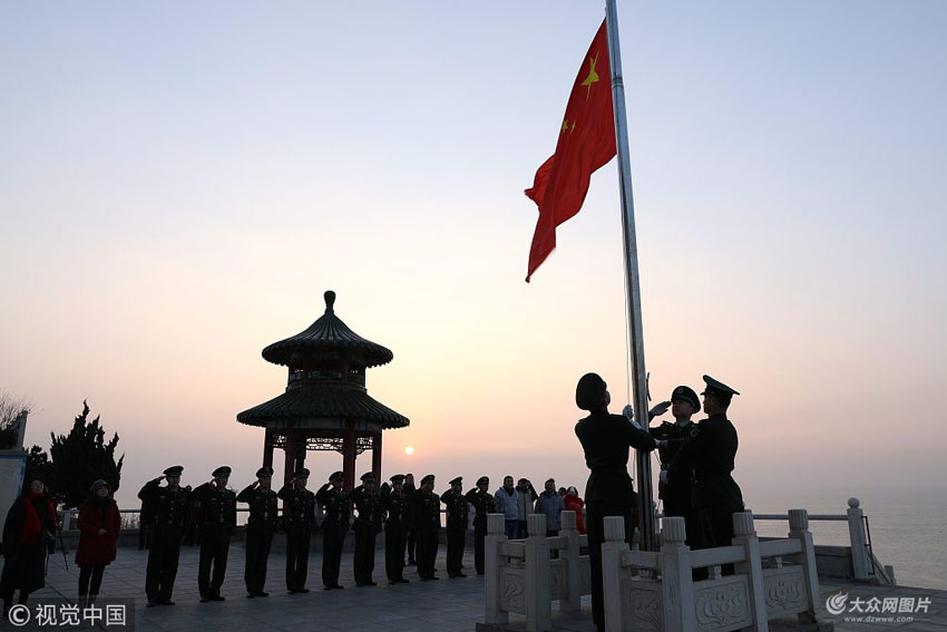 1月1日,在榮成市成山頭,榮成邊防官兵正在舉行升國(guó)旗儀式,迎接新年第一天。
