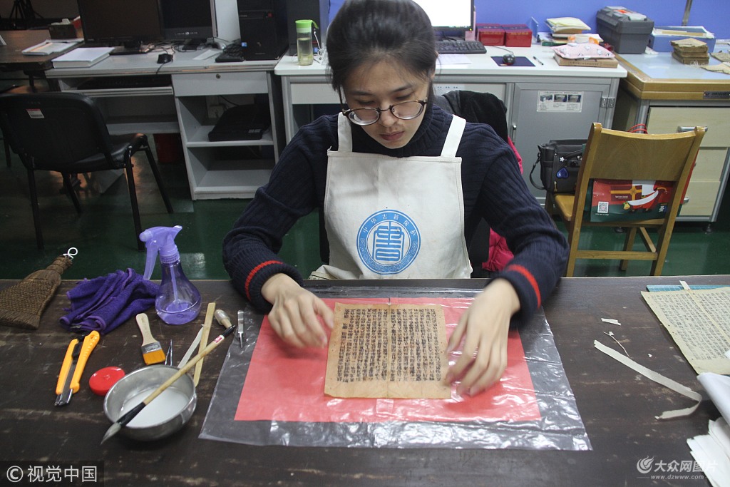 山東師范大學90后修書人夏天妮用工具治療著他們的“病人”——破損書籍。
