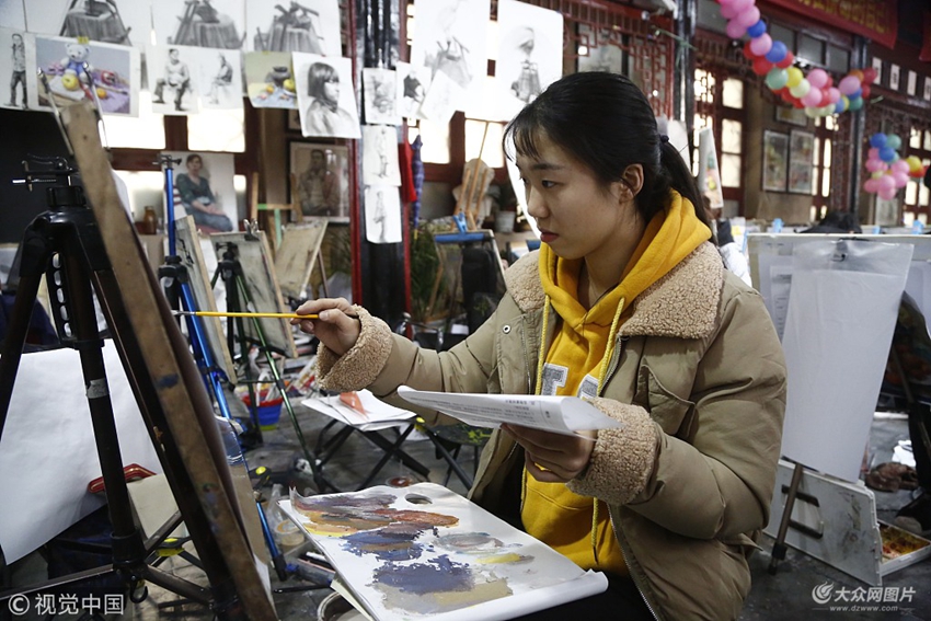 2018年1月5日,山東泰安,藝考生們在備戰(zhàn)考試。