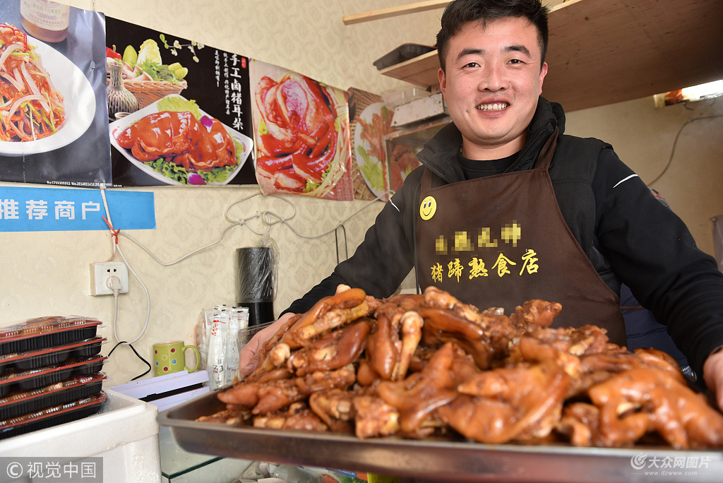 2018年1月21日,在山東省日照市文華街一個(gè)專賣豬蹄的小店里,今年26歲的王輝正在忙著制作豬蹄。