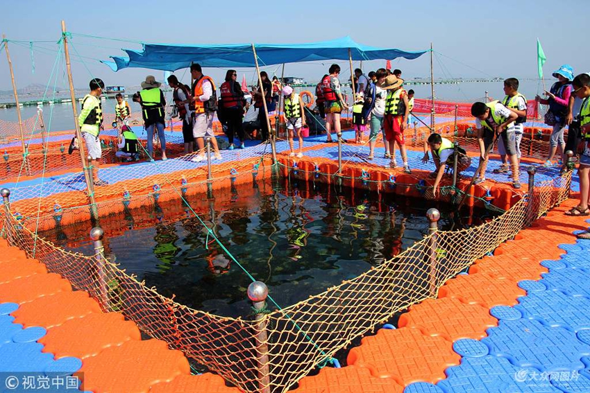 2015年8月23日,在山東省榮成市桑溝灣海洋牧場里,游客在釣魚。