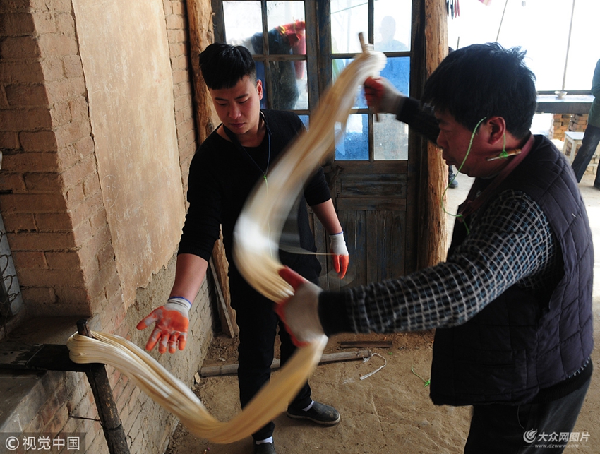 2018年1月24日,在山東省聊城市高唐縣清平鎮小屯村,劉修良在反復抻拔糖塊,待柔軟且色澤白亮后準備做糖瓜。