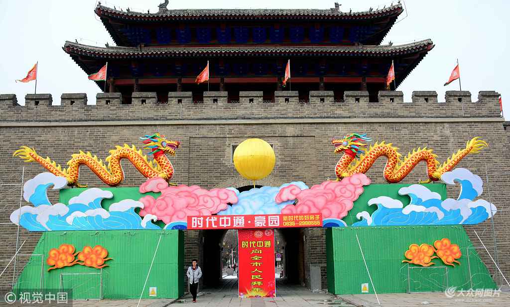 組照說明:2018年1月30日,山東聊城古城區亮相多組巨型花燈,這些花燈是為2018年新春燈會專門打造制作的,亮相的的花燈主要突出展現傳統中國節日元素,一般高度都在10米左右,被懸掛在古城區的城門之上,遠望去喜氣洋洋年味漸濃。