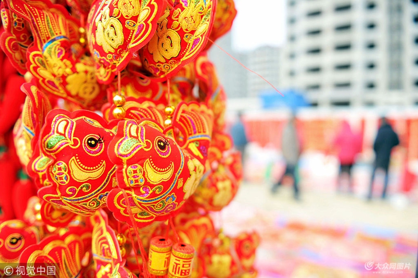 2018年1月30日,山東青島西海岸新區(qū)一農(nóng)村大集,市民在購買福字和春聯(lián)。