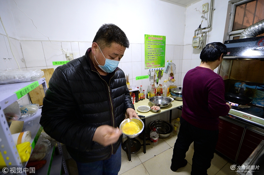 2018年2月5日,濟南。來自菏澤的黃佩軍(左)和武傳軍在廚房里做菜。