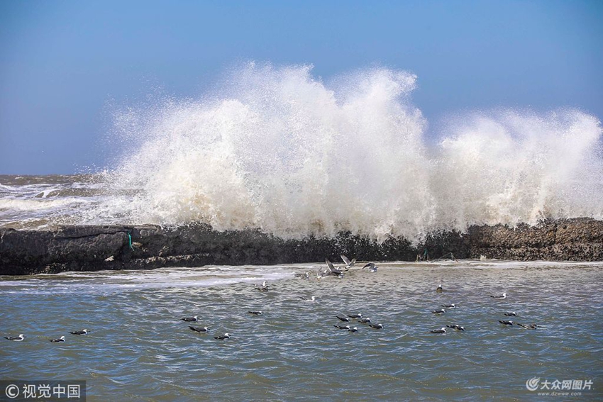 018年3月5日中午,山東威海市黃海海域漲大潮,大潮帶來了波浪滾滾和驚濤拍岸的壯麗景象猶如畫卷,令人震撼。