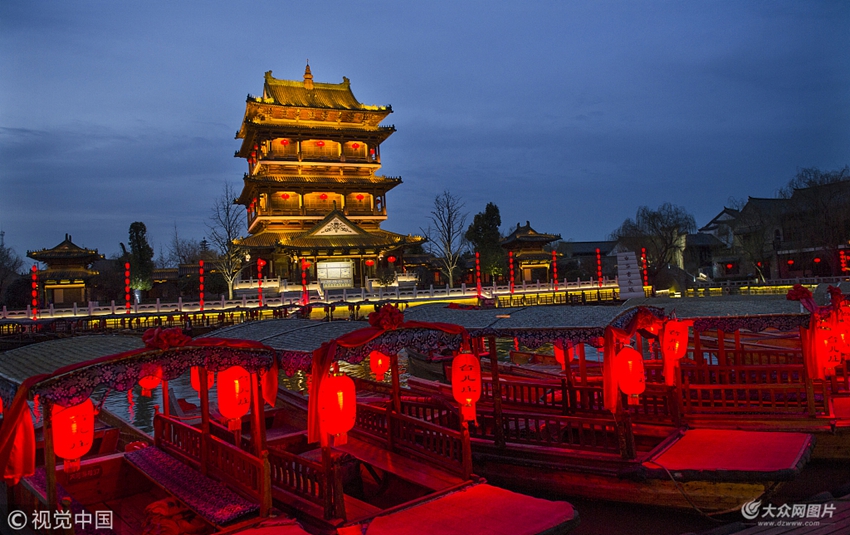 2018年3月5日,山東省棗莊臺兒莊古城五彩繽紛,景色怡人,再現(xiàn)“一河漁火,歌聲十里,夜不罷市”的歷史古韻。