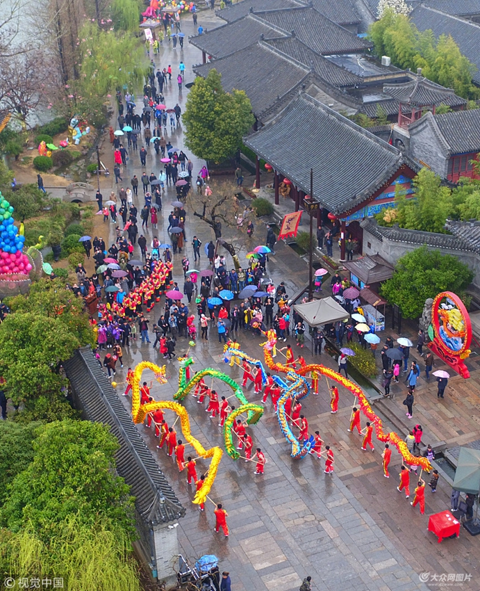 2018年03月18日,山東棗莊,在臺(tái)兒莊古城開河祈福大典上,民間舞龍隊(duì)正在表演“龍?zhí)ь^”。