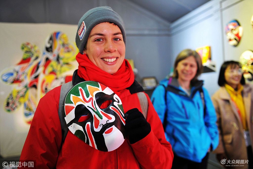 2018年3月21日,山東青島西海岸新區(qū)非物質(zhì)文化遺產(chǎn)展示體驗中心,克利伯環(huán)球帆船賽部分船員在參觀京劇臉譜制作。