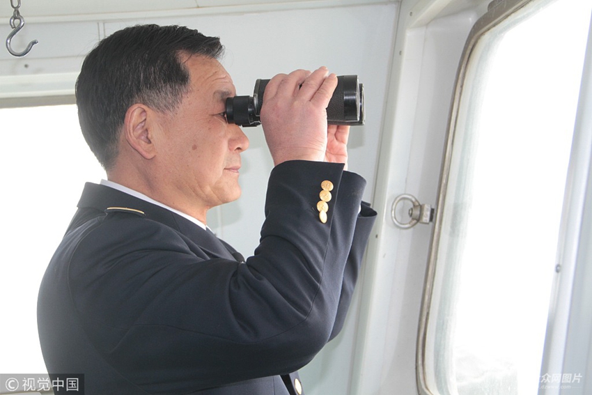 2018年3月22日,青島。他叫陳華飛,是北海航海保障中心青島航標處海巡1501輪的老船長,從業近40載,每天都以船為家,守護著青島附近海域的600多個航標,在茫茫大海上為過往船只鋪好道路、指明方向。一把方向舵、一處3尺指揮臺就成了他最平凡的一生。圖為老船長陳華飛在用望遠鏡觀察附近海域。