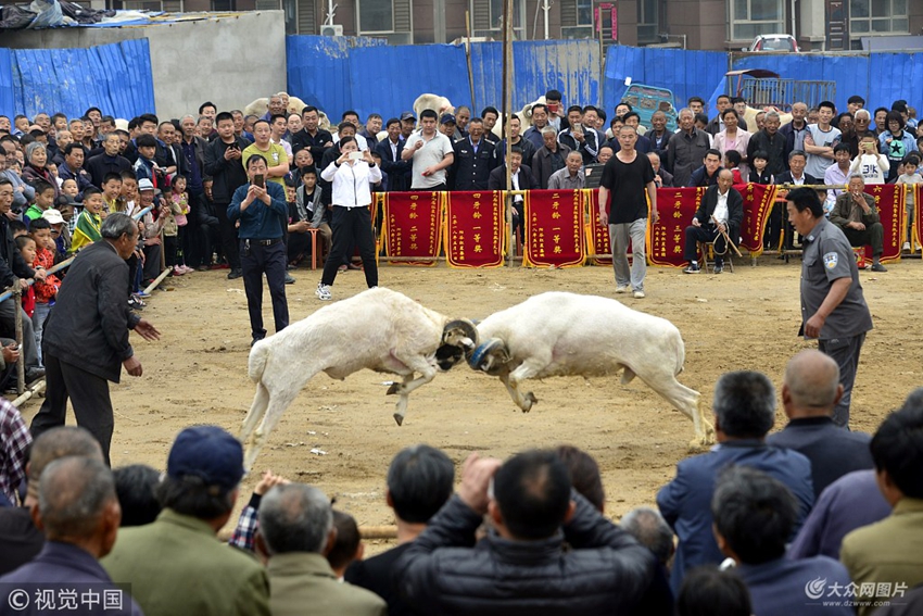 2018年5月1日,在山東省聊城市陽谷縣僑潤街道城角徐村 紅星廣場“紅星杯”第九屆魯西地區(qū)抵羊大賽活動現(xiàn)場,村民在參加抵羊大賽。