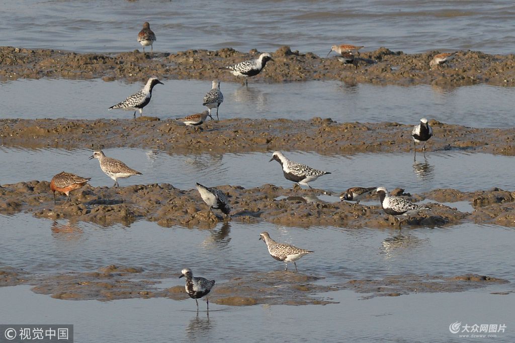 2018年5月8日,青島,成群北美金鸻在青島沿海灘涂上覓食。