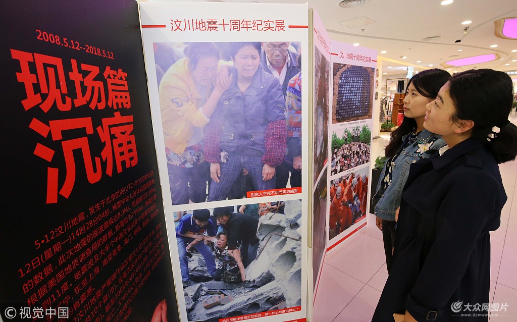 2018年5月10日,山東省濰坊市,市民正在觀看“汶川地震十周年紀(jì)實圖片展”。圖片作者:張馳/視覺中國