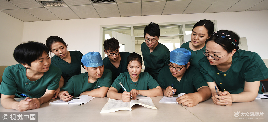 2018年5月10日,山東省鄒平縣中醫院手術室的幾位男護向女護士請教學習。圖片作者:董乃德/視覺中國