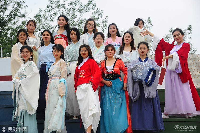 2018年05月15日,濟南,在山財大舜耕校區,同學們穿著漢服擺出姿勢拍攝畢業照。