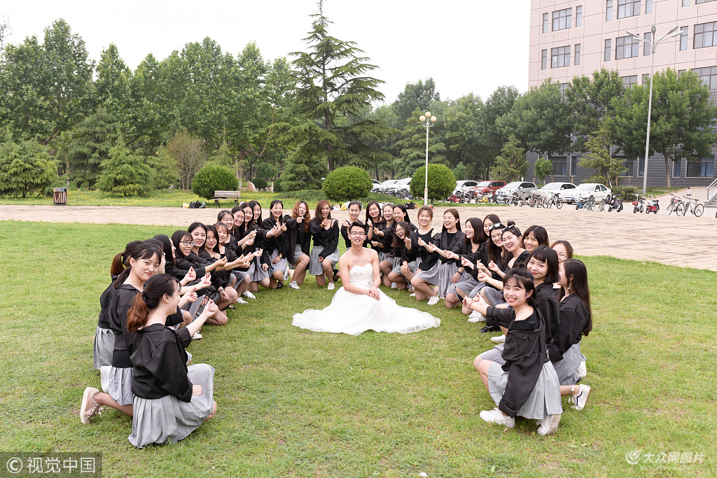 組照說明:2018年5月17日,山東聊城,又到一年畢業季,聊城大學文學院2014級漢語言文學專業5班畢業生拍攝畢業照,該班級只有一名男生,男女比例達到1:36,畢業生身穿婚紗、小時代、中山裝“簇擁”著班里唯一的一名男生,在學校的各角落拍攝下創意畢業照,留下青春的回憶。