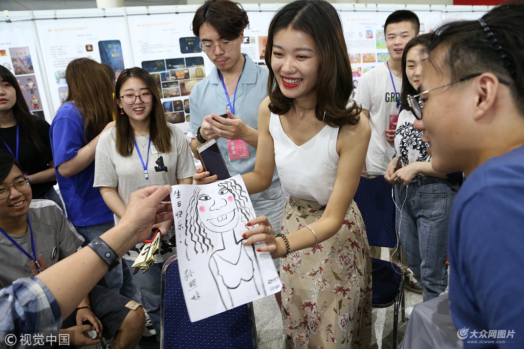 2018年5月19日上午,濟南,在山東工藝美術學院的畢業作品展上,一位頭發花白,戴著眼鏡的老師現場為畢業生作畫,畫得卡通形象惟妙惟肖,以此作為禮物送別畢業生,引眾人羨慕不已。