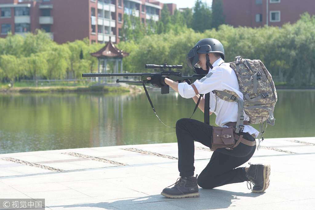 2018年5月19日,山東青島,山東科技大學(xué),大四學(xué)生拍“吃雞”畢業(yè)照紀(jì)念青春。圖為王新龍手拿AWM狙擊步槍模擬游戲中的動作正在瞄準(zhǔn)。