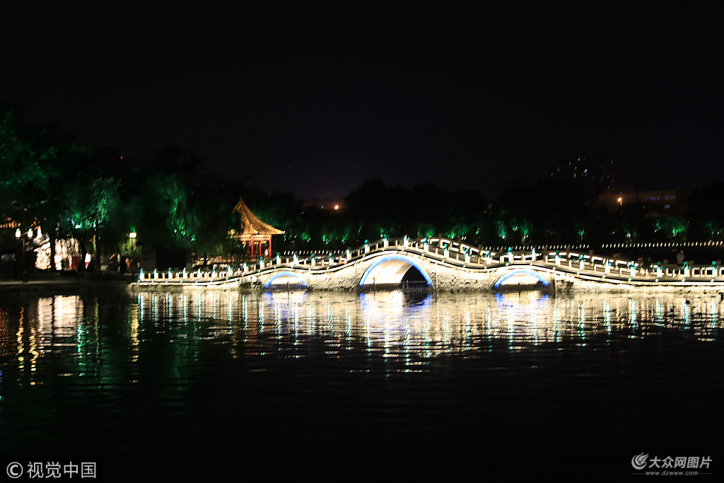 2018年5月23日,濟南,大明湖景區燈光璀璨美不勝收,吸引市民爭相合影留念。