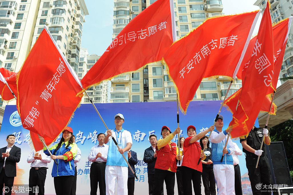 2018年5月27日,青島服務(wù)上合峰會(huì)志愿者誓師大會(huì)召開(kāi),志愿者接過(guò)旗幟為青島加油。