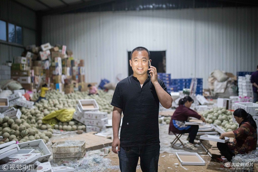 2018年5月25日,山東省莘縣魏莊鎮東江店村,恰逢網紋瓜上市,李金冰和當地果農每天都忙著采摘和銷售網紋瓜。圖片作者:銳圖-許康平/視覺中國