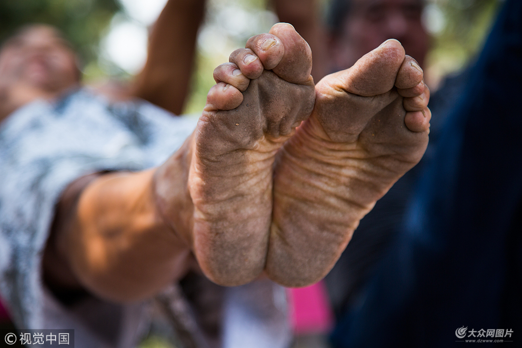 2017年6月17日,濟南,多年的赤腳鍛煉,老姚雙腳磨練的如同鐵板一樣。圖片作者:王劍/視覺中國