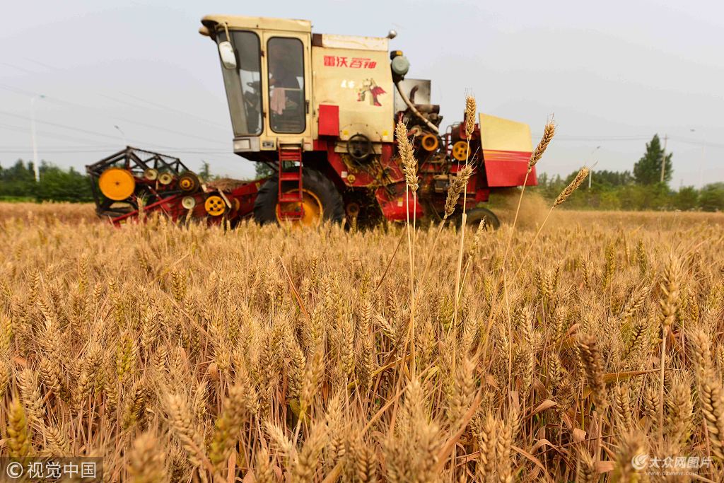 2018年6月7日,山東省濰坊青州市益都街道冉家村農民在收獲小麥。圖片作者:森林/視覺中國