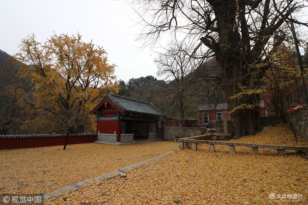 2018年11月16日,山東泰安,在泰山玉泉寺,數(shù)棵千年銀杏樹,樹下落滿黃葉,像金黃的地毯鋪了一地,美不勝收,宛如金黃色的童話世界。圖片作者:劉培俊/視覺中國